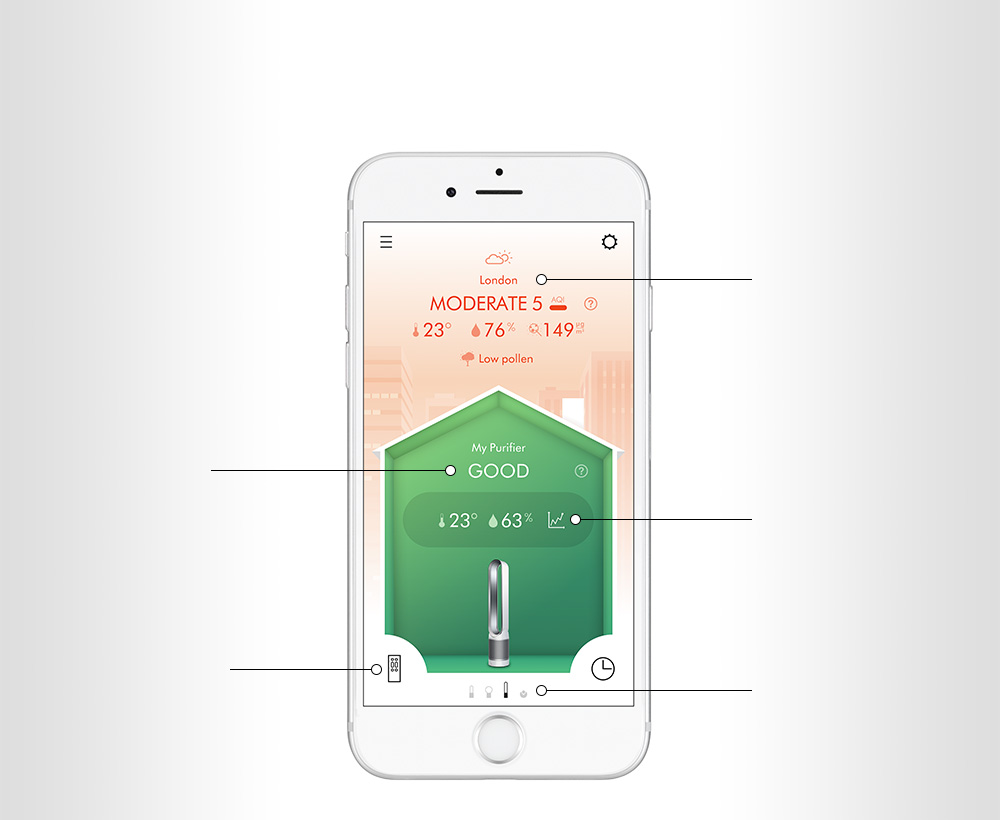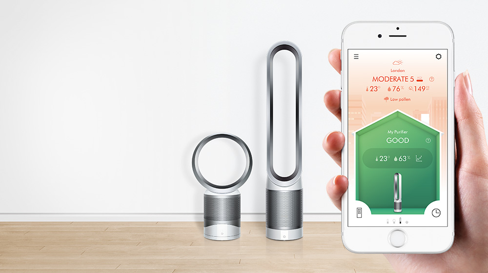 Oczyszczacz firmy Dyson zasysa powietrze z pomieszczenia i wysyła wyniki pomiaru jego jakości do aplikacji.